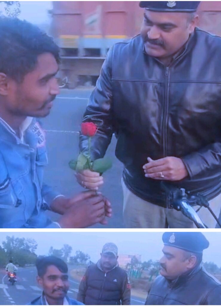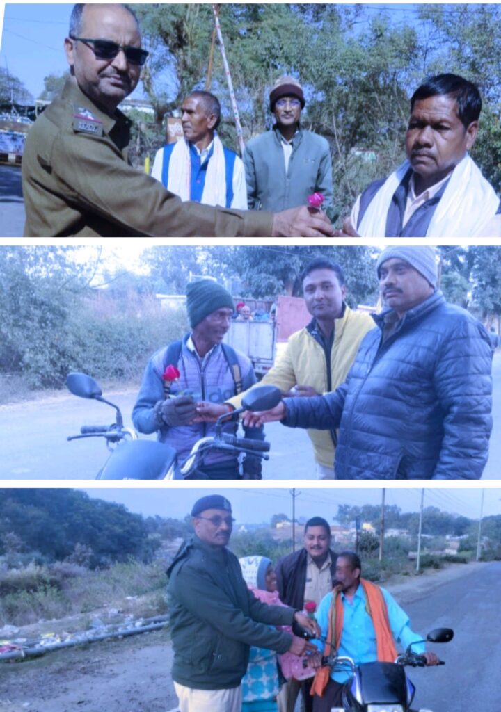 गौरतलब है।कि- दिनांक 08/01/26 को पुलिस महानिरीक्षक दीपक झा, (IPS),( सरगुजा) रेंज, सरगुजा के निर्देशन एवं पुलिस अधीक्षक श्रीमती रत्ना सिंह (IPS) के मार्गदर्शन पर जिला- इकाई मनेंद्रगढ़-चिरमिरी-भरतपुर के अंतर्गत आने वाले समस्त थाना- क्षेत्रों में थाना /चौकी प्रभारियों द्वारा यातायात जागरूकता विशेष अभियान चलाया गया। उक्त अभियान दौरान बिना हेलमेट वाहन चला रहे ।चालकों को चिन्हित कर, उन्हें गुलाब का फूल देकर यातायात नियमों के पालन हेतु प्रेरित एवं प्रोत्साहित किया गया। साथ ही उन्हें यह भी समझाइश दी गई ।कि -हेलमेट पहनना केवल कानूनी बाध्यता नहीं, बल्कि आपके जान की सुरक्षा का सबसे मजबूत कवच है।