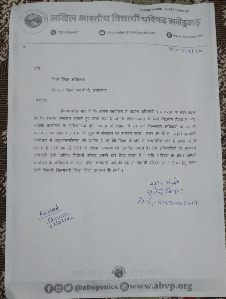 विगत दिनों एक जिला शिक्षा अधिकारी के कार्यालय का विडियो सोशल मीडिया पर काफी वायरल हुआ था।जिसमें संबंधित कर्मचारी द्वारा डियूटी वक्त टेबल पर पैर रखकर आराम फरमाते और मोबाइल चलाते देखा गया था । उक्त विडियो के वायरल होते ही अब उक्त मामला तूल पकड़ता चला जा रहा है। उक्त मामले को लेकर अखिल भारतीय विद्यार्थी परिषद ने आडे हाथों लेते हुए शिक्षा विभाग की कार्य संस्कृति, अनुशासन और मर्यादा को लेकर गंभीर सवाल खड़े कर दिए हैं।और उक्त विषय को गंभीरता से लेते हुए अखिल भारतीय विद्यार्थी परिषद (ABVP) नगर इकाई मनेंद्रगढ़ के कार्यकर्ताओं ने जिला शिक्षा अधिकारी को उक्त संबंध में एक ज्ञापन भी सौंपा है। उक्त ज्ञापन में लेख किया गया है। कि- शासकीय कार्यालयों में इस प्रकार का आचरण ,नियमों के प्रतिकूल है ।और इससे शिक्षा विभाग की गरिमा को ठेस भी पहुँचती है।ABVP ने ज्ञापन सौंप मांग कि है कि- उक्त प्रकरण की निष्पक्ष जांच कर दोषी कर्मचारी पर सख्त कार्रवाई की जाए। तथा भविष्य में ऐसी घटनाओं की पुनरावृत्ति रोकने के लिए कर्मचारियों को व्यवहार, अनुशासन एवं कार्य संस्कृति से संबंधित प्रशिक्षण दिया जाए।साथ ही संबंधित कर्मचारी के विरुद्ध समय सीमा पर कार्यवाही न होने की स्थिति में पुरी तरह से लामबंद हो चरणबद्ध तरीके से आंदोलन किए जाने की बात भी कही गई है।