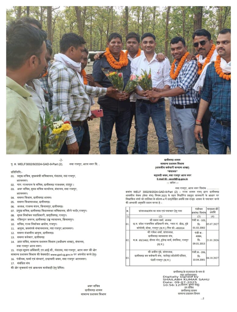 अत्यंत हर्ष का विषय है छत्तीसगढ़ वन कर्मचारी संघ के सम्मानित प्रदेश अध्यक्ष श्री अजीत दुबे जी एवं प्रदेश टीम के छत्तीसगढ़ शासकीय सेवक (सेवा संघ) नियम 2025 के तहत मान्यता हेतु निर्धारित जानकारी प्रस्तुत करने पश्चात किए गए विशेष प्रयासों से *हमारे छत्तीसगढ़ वन कर्मचारी संघ पंजीयन क्रमांक 206 को राज्य शासन से पत्राचार करने पूर्ण मान्यता एवं अनुमति प्रदान की गई है।