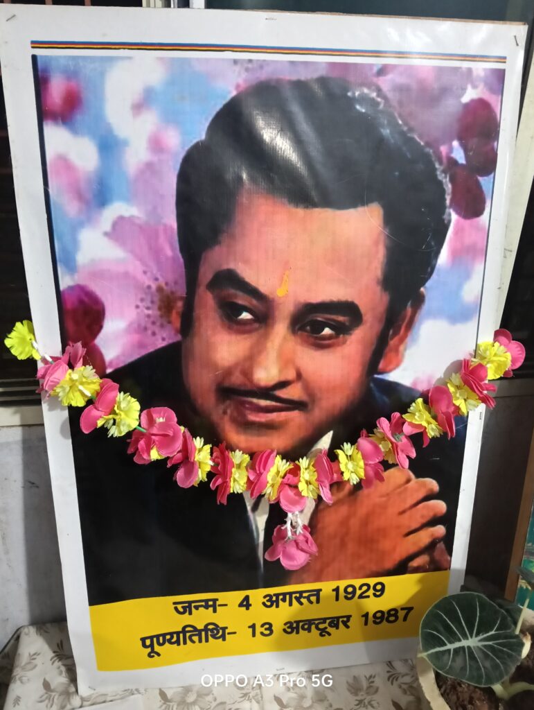 इनसेट में – पुण्य तिथि उपलक्ष्य पर किशोर कुमार के लगे छायाचित्र.