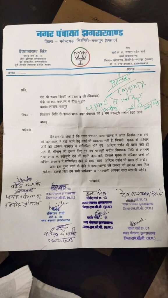क्या है मांगे ——— विदित हो कि – उक्त पत्र में लेख किया गया है।कि – नगर पंचायत झगराखाड में आज दिनांक तक शव को (अल्पकाल) में रखे जाने हेतु कोई व्यवस्था नहीं है। जिससे मृतक के परिवारजनों को अंतिम संस्कार में सम्मिलित होने एवं अंतिम दर्शन भी प्राप्त नहीं हो पाता है।जिसके लिए जनप्रतिनिधियों द्वारा क्षेत्रिय विधायक एवं प्रदेश के स्वास्थ्य मंत्री मान.श्री श्याम बिहारी जयसवाल जी से 02 नग (म्यूचरी ) मशीन की मांग रखी गई थी।जिसे स्वास्थ्य मंत्री श्री जयसवाल जी द्वारा उक्त मांगों को प्राथमिकता देते हुए पुर्ण आश्वासन सहित उक्त जनहित के मांग पर अपनी स्वीकृति प्रदान किया गया है।और जल्द ही राशि भी प्रदान हो सकेगी उक्त वजह से अब मृतक के परिवारजनों को अंतिम संस्कार में शामिल होने के साथ-साथ अंतिम दर्शन भी प्राप्त हो सकेगा ।जिसका लाभ सीधा -सीधा नगर पंचायत झगराखाड क्षेत्रवासियों को बड़े आसानी से मिल सकेगा । जो एक बड़ी सराहनीय पहल है।