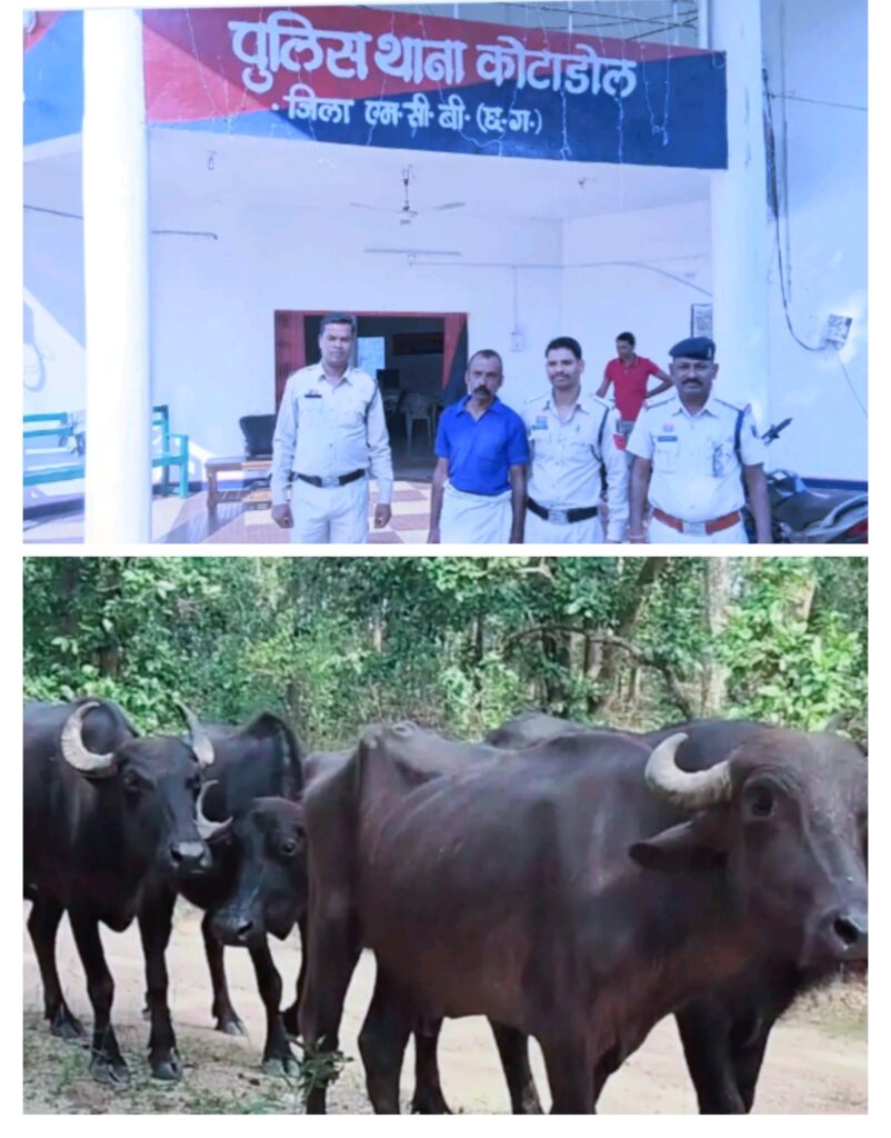विदित हो कि – प्रशासनिक दृष्टिकोण से कसावट लाने और अवैध कारोबारियों में पुलिस का खौफ कायम करने उद्देश्य से इन दिनों एमसीबी जिला क्षेत्र अंतर्गत थाना – कोटाडोल पुलिस एक्शन मोड़ पर है।और एक के बाद एक दनादन अवैध पशुओं की तस्करी, शराब,जुआ , सट्टा मादक पदार्थ गांजा के विरुद्ध वरिष्ठ -अधिकारियों के दिशा-निर्देश एवं मार्गदर्शन के आधार पर मुखबिर सक्रिय किए गए हैं।और लगातार कार्यवाही करते हुए अवैध गतिविधियों पर निरंतर हरसंभव नकेल कसी जा रही है। उक्त संदर्भ में मिली- जानकारी अनुसार थाना- प्रभारी कोटाडोल को मुखबिर माध्यम सूचना प्राप्त हुआ दशरथ यादव नामक व्यक्ति द्वारा अवैध रूप से पशुओं को रख कर पैदल उक्त मवेशियों को मारते -पीटते हंकाते ग्राम-ढोरगी जंगल के रास्ते होते आ रहा है। उक्त प्राप्त सूचना के आधार पर हमराह – स्टाफ को मौके पर तलब कर कार्यवाही किए जाने रवाना किया गया जो उक्त मुखबिर के बताए मार्ग पर संदेही- दशरथ यादव आ.गोपाल यादव उम्र लगभग 45 वर्ष निवासी- लावाहोरी थाना – कोटाडोल जिला- एमसीबी (छ.ग)का 11 नग मवेशियों के साथ उक्त पुलिस टीम को मिला जिससे उक्त मवेशियों के संबंध वैध- दस्तावेज पास- परमिट की मांग नोटिस तामील करा दशरथ यादव से पुलिस टीम द्वारा मांगा गया जो किसी भी प्रकार कोई वैध दस्तावेज न होना बताया जाकर 5 नग भैसा एवं 6 नग भैसी को ले जाते सदर सबूत का पाये जाने से तथा उक्त भैसा- भैंसी जो काफी अधेड़ व कमजोर अवस्था में दिखाई प्रतित हुए। तत्पश्चात थाना – कोटाडोल पुलिस द्वारा उक्त मवेशियों का पंचनामा तैयार कर संयुक्त रूप से उक्त मवेशियों को अपने कब्जे में ले विधिवत बरामद कर आरोपी के विरुद्ध थाना कोटाडोल में (छ.ग )क्रषक पशु परिरक्षण अधिनियम की धारा – 4,6,10 एवं पशुओ के प्रति क्रुरता निवारण अधिनियम की धारा 11(1)का अपराध पंजीबद्ध कर विवेचना में लिया गया। उक्त मवेशियों की अनुमति किमत 3 लाख रुपए आंकी गई है।वहीं आरोपी को मान. न्यायालय के न्यायिक रिमांड पेश कर (जेल) दाखिला कराए जाने की कार्यवाही सुनिश्चित किया गया है।